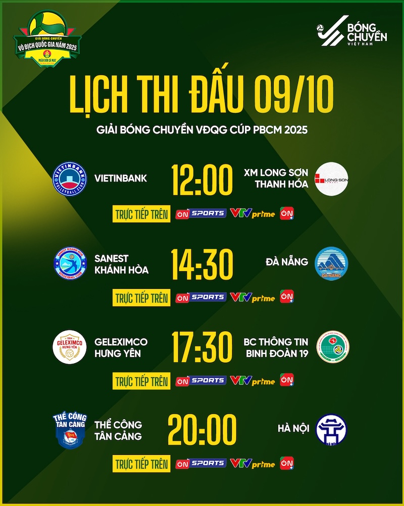 Cập nhật lịch thi đấu giải bóng chuyền VĐQG 2025 ngày hôm nay 9/10 với 4 trận đấu hấp dẫn, tâm điểm là cuộc đụng độ giữa Sanest Khánh Hoà và Đà Nẵng.