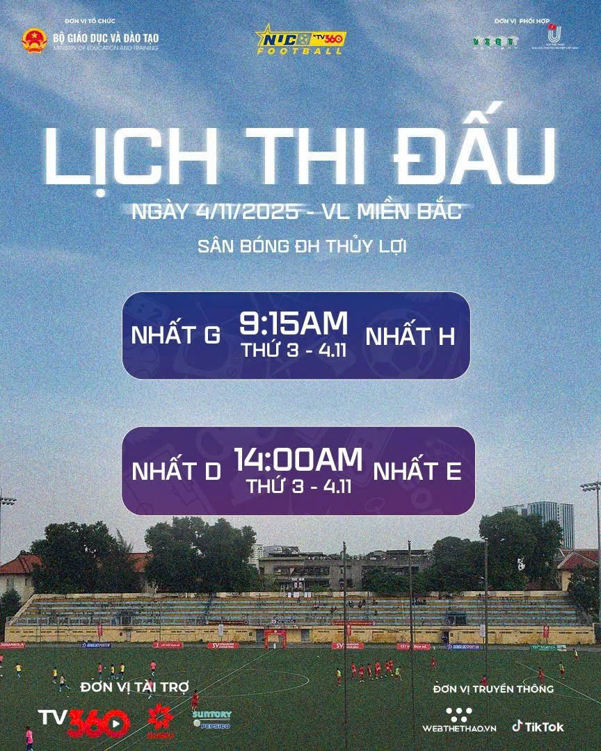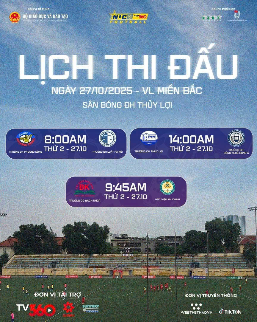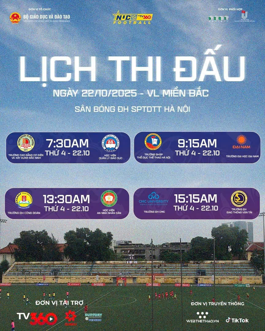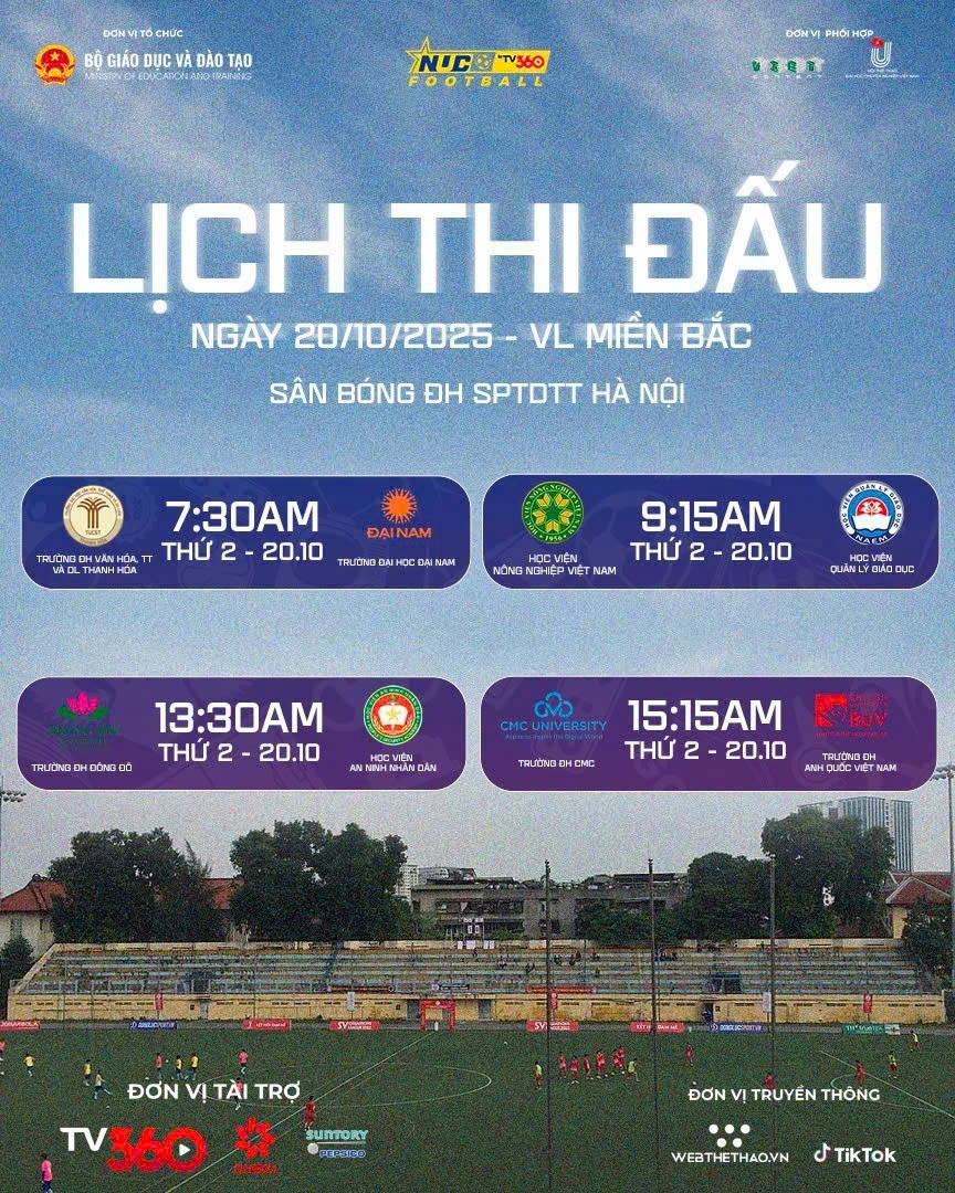 Giải bóng đá Sinh viên toàn quốc 2025 Cúp TV360 vòng loại miền Bắc đã chính thức công bố lịch thi đấu của 21 đội, chia làm 7 bảng tại hai địa điểm đăng cai là Trường Đại học Sư phạm Thể dục thể thao Hà Nội và Trường Đại học Thủy Lợi.