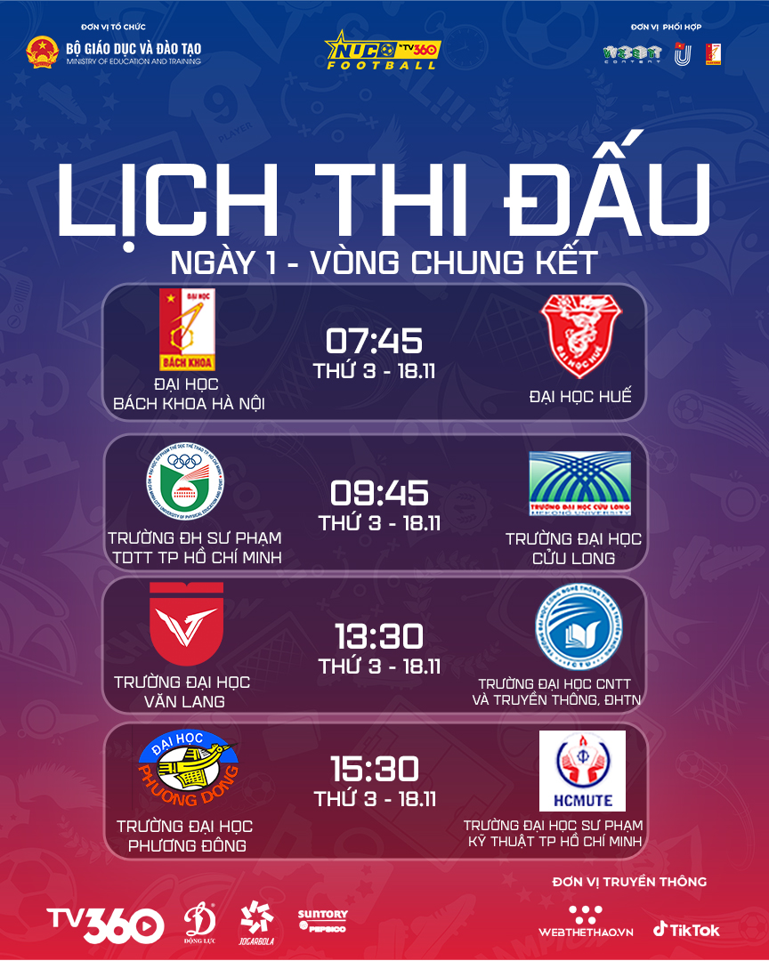 Sau lễ khai mạc diễn ra vào 7h00 sẽ là cuộc đối đầu giữa Đại học Bách Khoa Hà Nội và Đại học Huế, mở màn cho những ngày sống cùng trái bóng của 16 đội tuyển đến từ 3 miền.