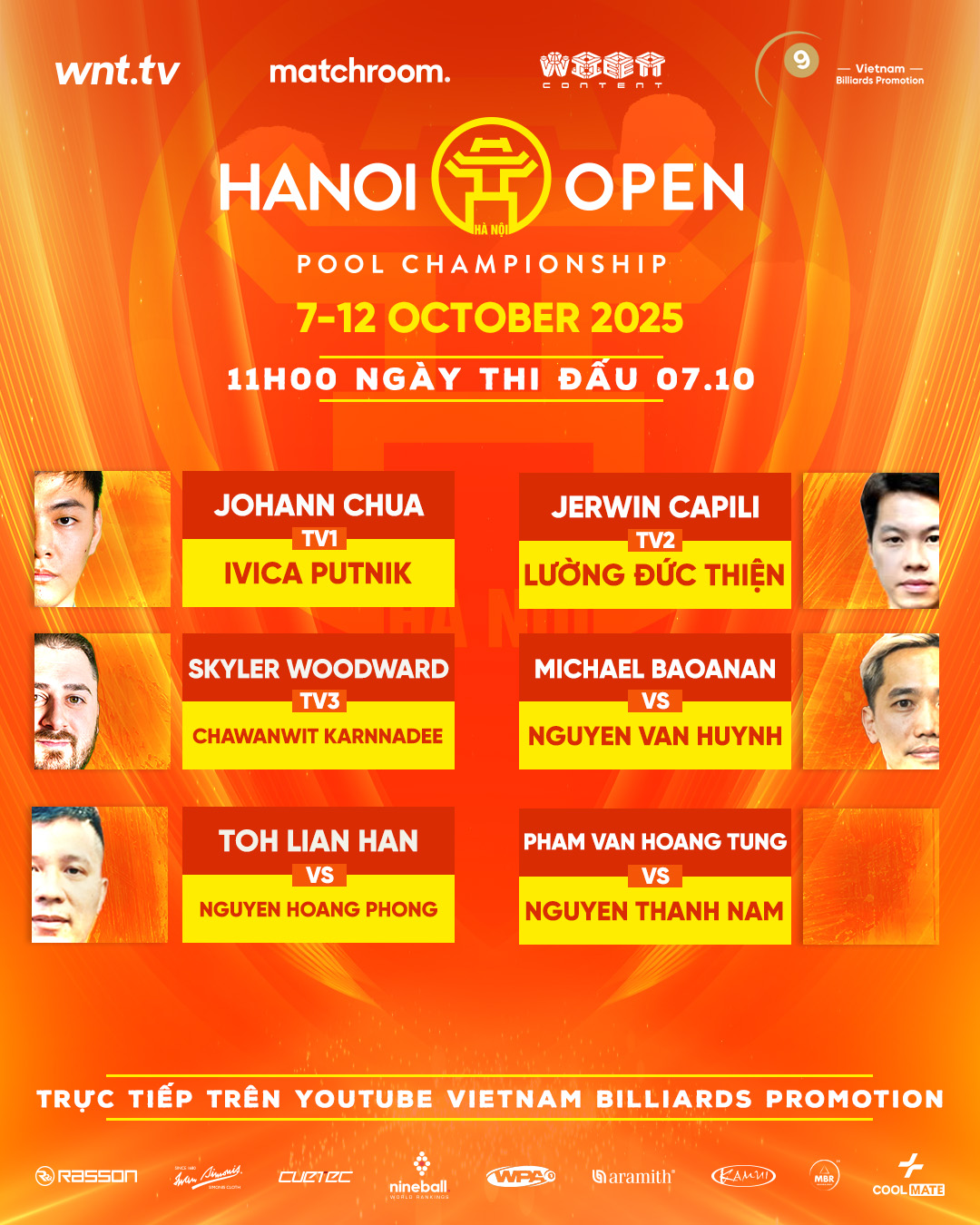 Tay cơ Việt Nam được kỳ vọng nhất Dương Quốc Hoàng sẽ gặp Kuo Hsuan Wei của Đài Bắc Trung Hoa ở lượt trận 17h. Cũng ở lượt 17h, Đỗ Thế Kiên đối đầu "thợ Philippines" đã quá quen thuộc với làng pool Việt Nam là Roland Garcia. Trong khi đó Đặng Thành Kiên chạm trán Mastato Yoshioka của Nhật Bản lúc 12h30, Nguyễn Anh Tuấn gặp tay cơ Việt Nam khác là Nguyễn Quang Huy lúc 14h00.