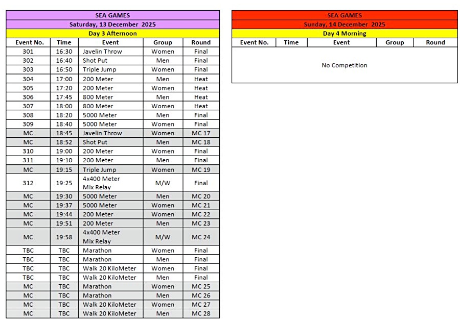 Lịch thi đấu điền kinh SEA Games 33 ngày thi đấu thứ 3 (ngày thứ 4 nghỉ)