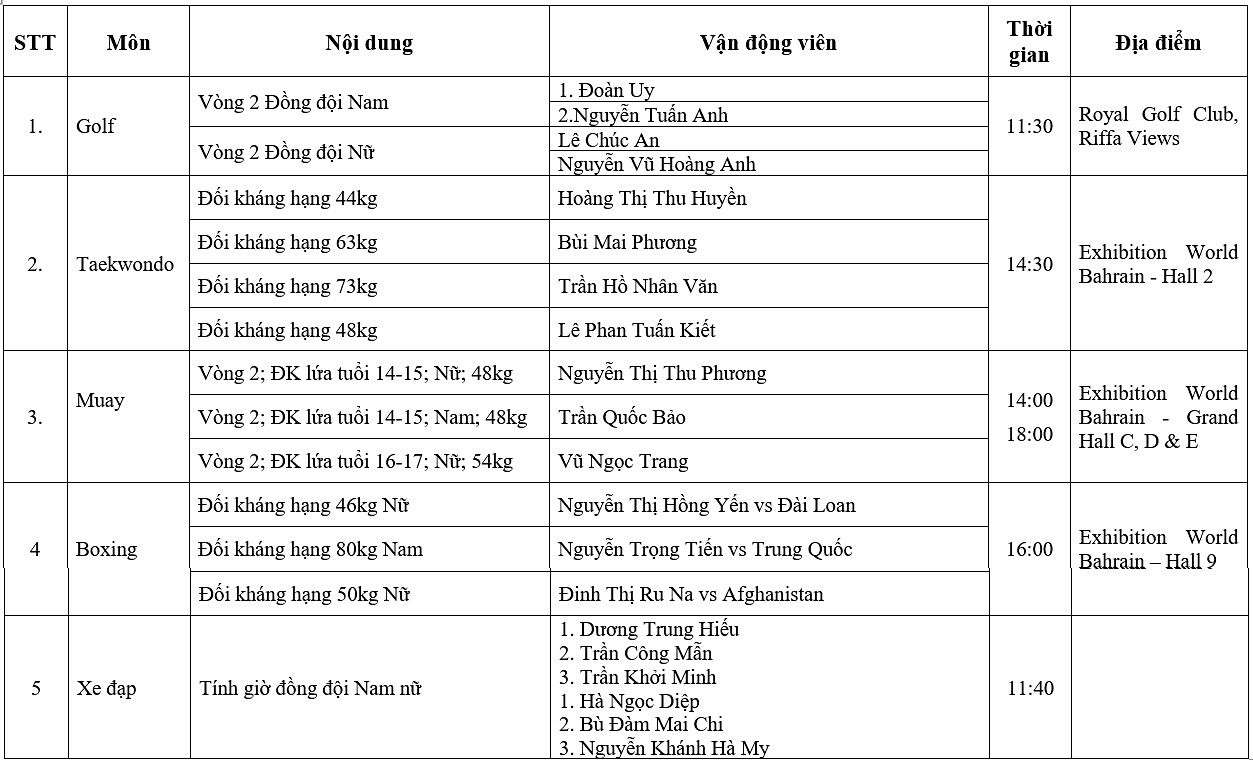 Ở ngày thi đấu chính thức thứ hai tại giải, đoàn Thể thao Việt Nam tiếp tục có VĐV tranh tài ở nhiều bộ môn, từ golf đến xe đạp và đặc biệt là nhóm môn võ gồm boxing, muay và taekwondo.