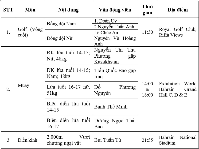 Trước đó, từ 11h30 các golfer sẽ tranh tài ở hai nội dung đồng đội nam và nữ. VĐV thi đấu muộn nhất trong ngày cũng là niềm hy vọng cuối cùng ở môn điền kinh, Bùi Tuấn Tú. Tuyển thủ trẻ này sẽ tranh tài ở đường chạy 2000m nam vượt chướng ngại vật.