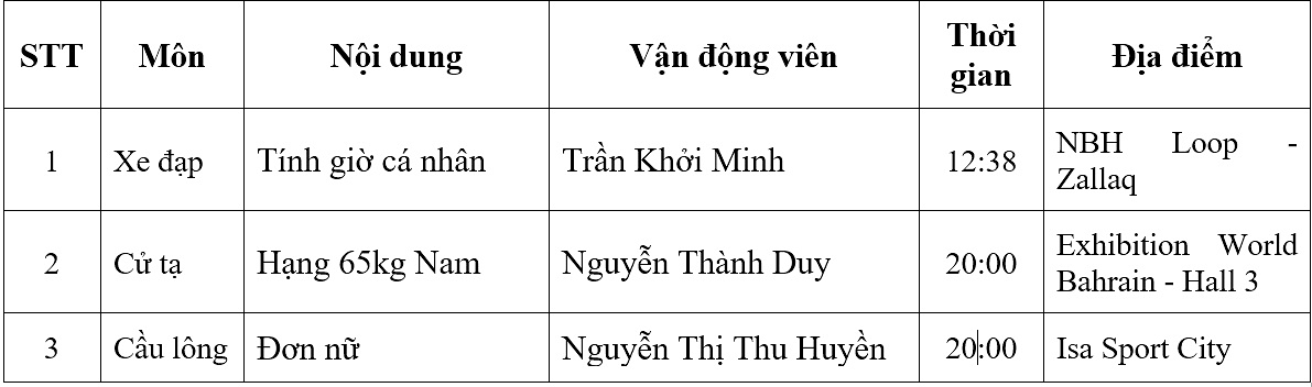 Trong ngày hôm nay 26-10 đoàn Thể thao Việt Nam sẽ tranh tài ở các môn thi gồm xe đạp, cử tạ và cầu lông. Đáng chú ý, gương mặt trẻ đầy tiềm năng Nguyễn Thị Thu Huyền sẽ xuất phát thi đấu ở nội dung đơn nữ môn cầu lông.