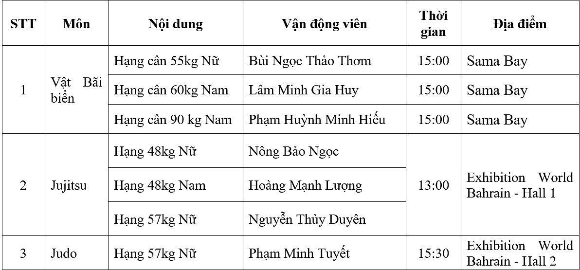 Tâm điểm của lịch thi đấu ngày hôm nay 30-10 của đoàn Thể thao Việt Nam đó là một loạt VĐV môn võ, vật sẽ thượng đài. Riêng bộ môn vật bãi biển sẽ chứng kiên 3 đô vật Việt Nam tranh tài ở các hạng cân 55 kg nữ, 60 kg và 90 kg nam. Vòng loại nội dung này diễn ra lúc 15h00 và chung kết đấu lúc 17h00.