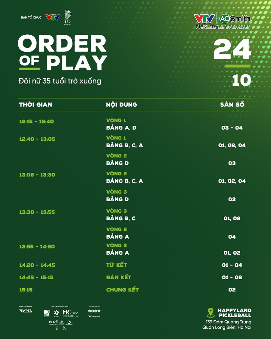 Lịch thi đấu VTV A.O. SMITH Pickleball Open 2025 ngày 24/10: