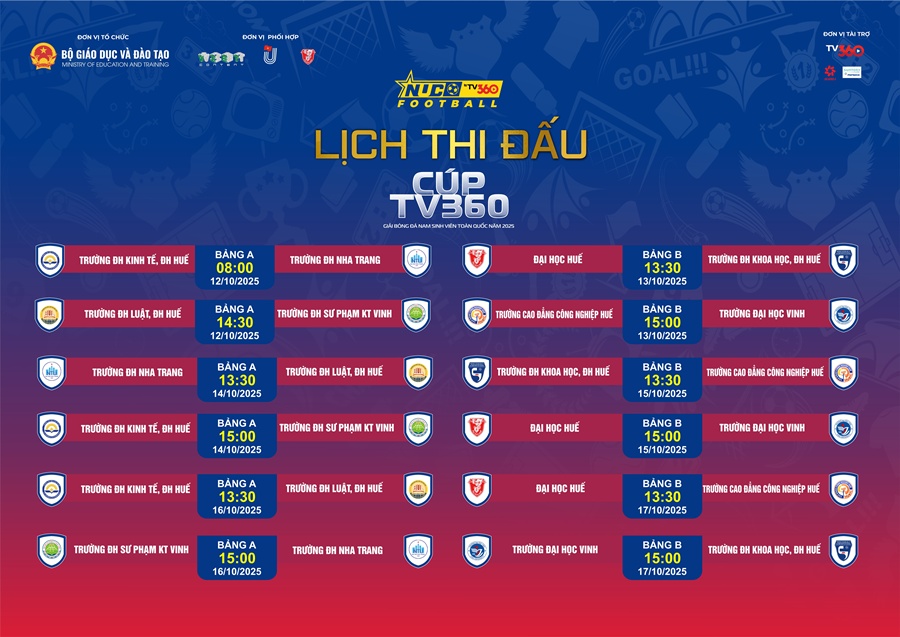 Vòng loại Giải bóng đá nam sinh viên toàn quốc năm 2025 - Cúp TV360 quy tụ 8 đội bóng đến từ khu vực miền Trung, thi đấu từ ngày 12-17/10 tại Sân vận động Trung tâm Văn hóa và Thể thao phường Phú Xuân (150 Nguyễn Trãi, TP Huế).