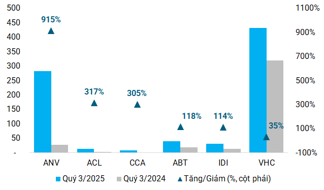 ANV dẫn đầu đà tăng, từng bứt phá tới 176% khi chính quyền Tổng thống Trump vừa công bố áp thuế, lên hơn 32,000 đồng/cp, vượt đỉnh 28,000 đồng/cp được thiết lập cách đây 3 năm. Thanh khoản quý 3 bình quân 5.7 triệu cp khớp lệnh mỗi phiên, gấp 3 - 4 lần so với giai đoạn trước đó.