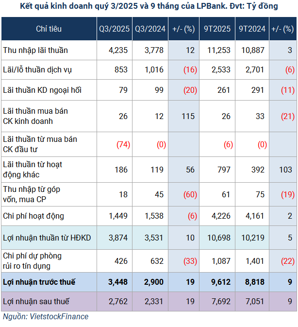 Lũy kế 9 tháng đầu năm 2025, LPBank đạt 9,612 tỷ đồng lợi nhuận trước thuế, tăng 9% so với cùng kỳ. Kết quả này chủ yếu đến từ thu nhập lãi thuần ổn định, lợi nhuận hoạt động khác tăng mạnh và chi phí dự phòng rủi ro tín dụng sụt giảm.