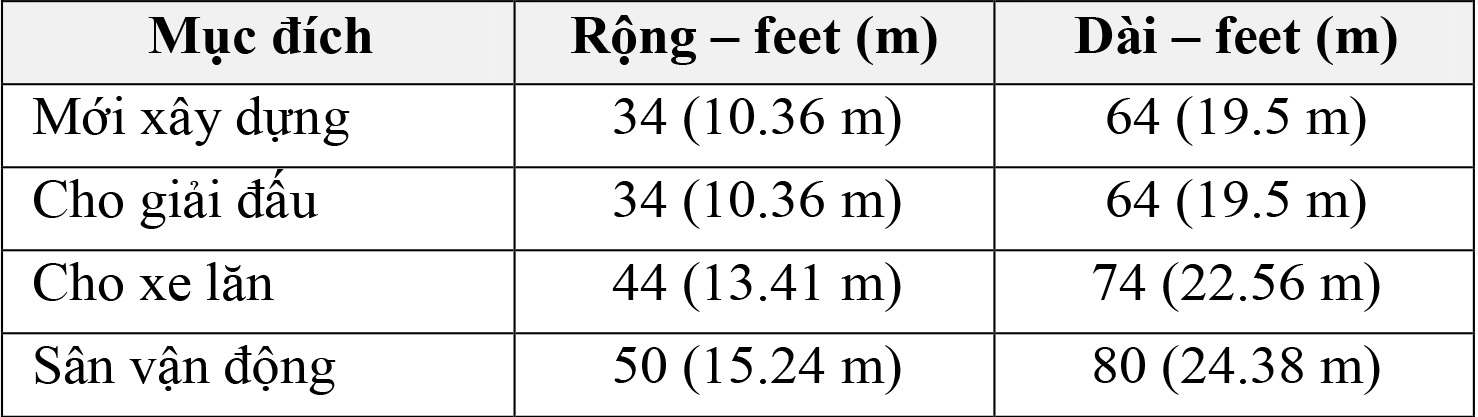 2.A.3. (Xe lăn) Diện tích bề mặt sân thi đấu được khuyến nghị dành cho xe lăn là rộng 13.41m (44 feet) và dài 22.55m (74 feet). Kích thước để thi đấu bằng xe lăn trong sân vận động là rộng 15.24m (50 feet) và dài 24.38m (80 feet).