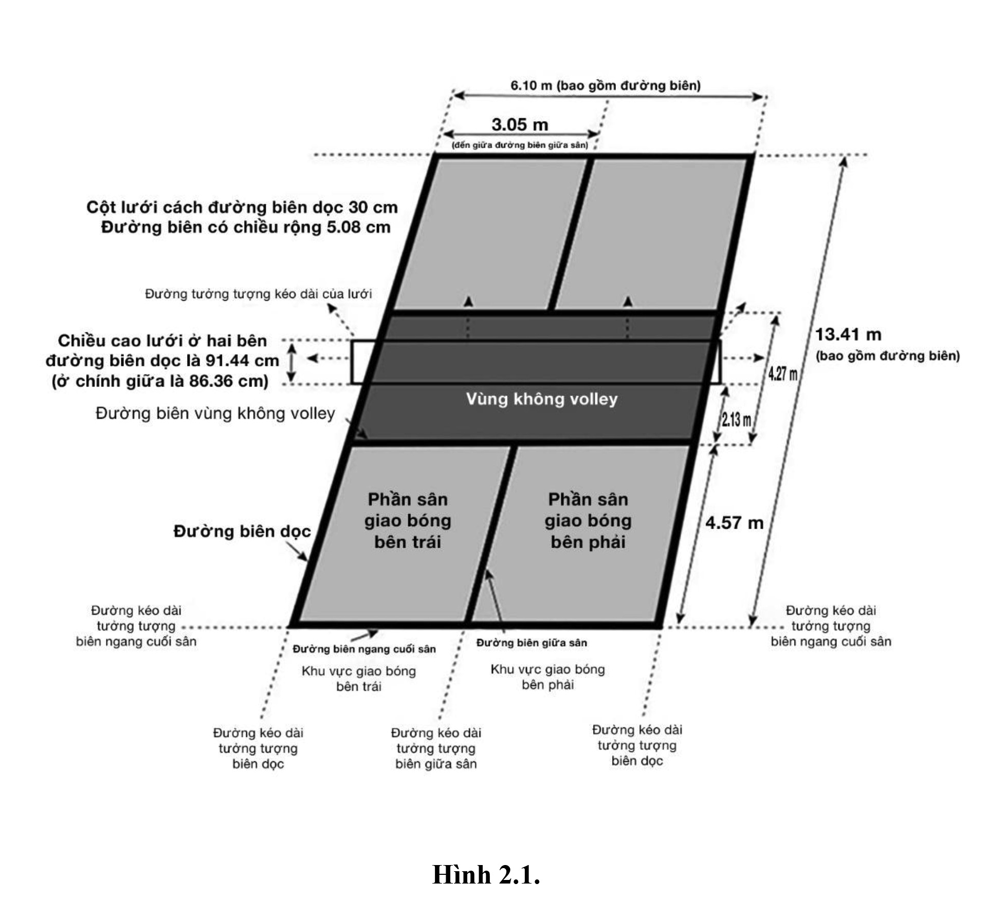 2.B. Đường kẻ và Khu vực. Các đường kẻ và khu vực của sân pickleball tiêu chuẩn được mô tả như sau (Hình 2-1):