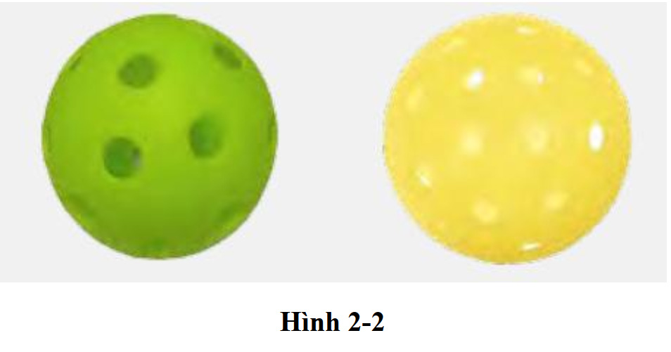 Quả bóng có lỗ lớn hơn (bên trái) thường được sử dụng cho chơi trong nhà, trong khi quả bóng có lỗ nhỏ hơn (bên phải) thường được sử dụng cho chơi ngoài trời. Màu sắc có thể thay đổi. Tuy nhiên, tất cả các quả bóng đã được phê duyệt đều có thể sử dụng cho cả chơi trong nhà và ngoài trời. Danh sách đầy đủ các quả bóng đã được phê duyệt có trên trang web của USA Pickleball.