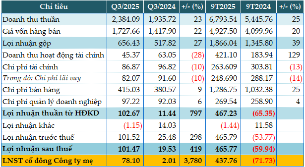 Lũy kế 9 tháng đầu năm, doanh thu của MML đạt gần 6,794 tỷ đồng, tăng 25% so với cùng kỳ, lợi nhuận sau thuế gần 467 tỷ đồng. Lãi ròng 9 tháng đạt gần 438 tỷ đồng, kéo lỗ lũy kế tính đến cuối quý 3/2025 giảm còn -604 tỷ đồng.