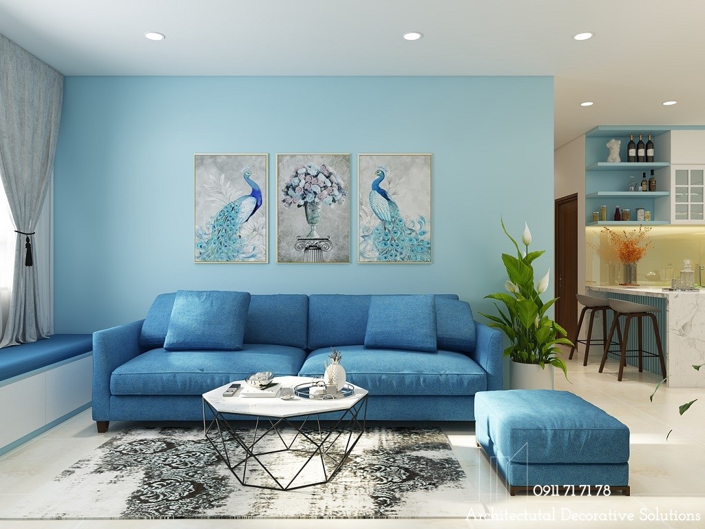 Màu xanh da trời thể hiện sự dịu dàng mát mẻ, an toàn và nghiêm trang. Bên cạnh đó, màu này cũng giúp hô hấp và nhịp tim được ổn định hơn. Bởi vậy, màu xanh da trời được ưu tiên dùng trong các không gian nội thất như phòng ngủ, phòng bếp, phòng khách.