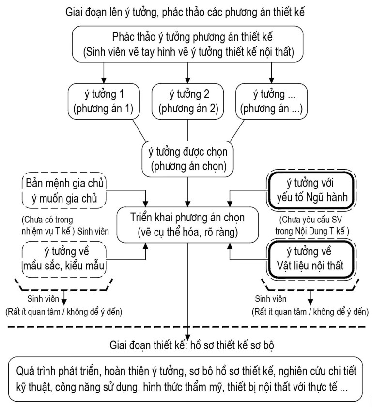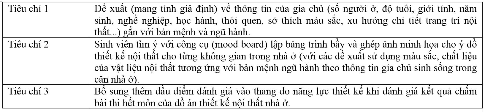 3. Đề xuất các bước tìm ý thiết kế và tiêu chí của nhiệm vụ thiết kế liên quan đến yếu tố ngũ hành và vật liệu nội thất cho sinh viên thực hiện đồ án nội thất nhà ở.