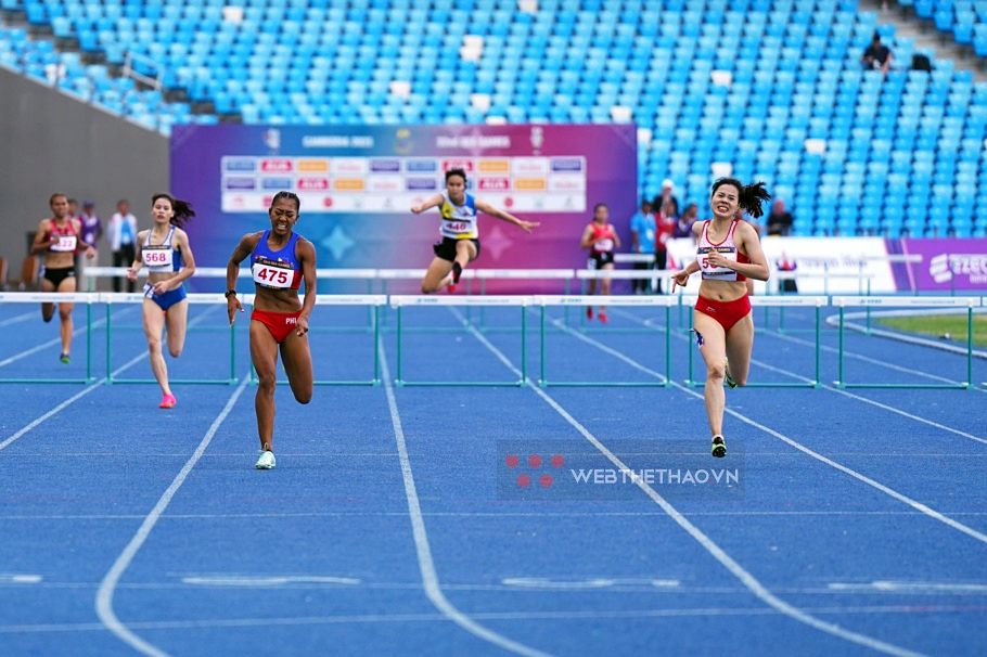 Robyn Brown (trái) ganh đua quyết liệt với Nguyễn Thị Huyền ở đường chạy 400m rào nữ tại SEA Games 32 ở Campuchia