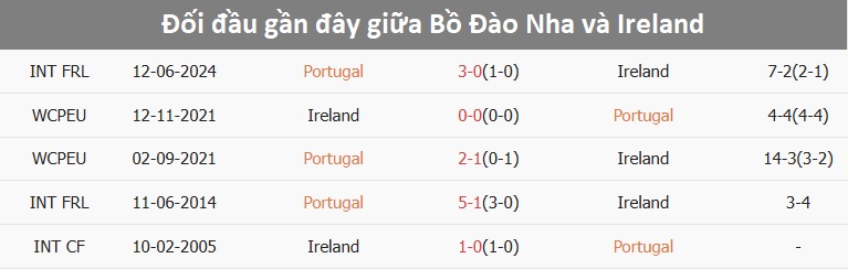 Lịch sử đối đầu Bồ Đào Nha vs Ireland