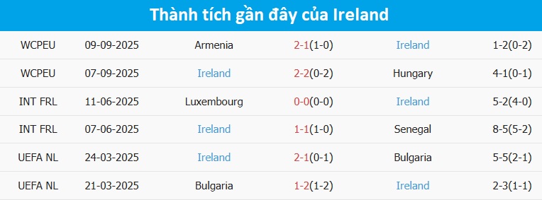 Phong độ Ireland 6 trận gần nhất