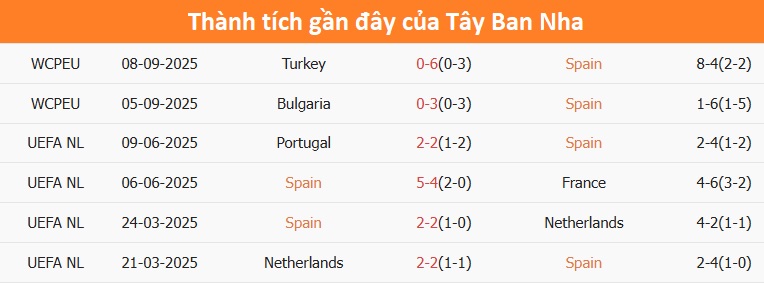 Phong độ Tây Ban Nha 6 trận gần nhất