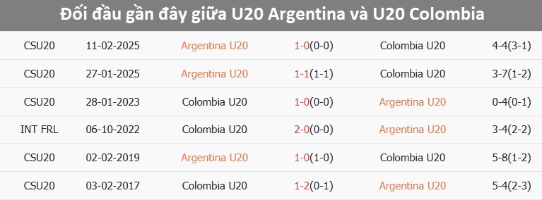 Lịch sử đối đầu U20 Argentina vs U20 Colombia