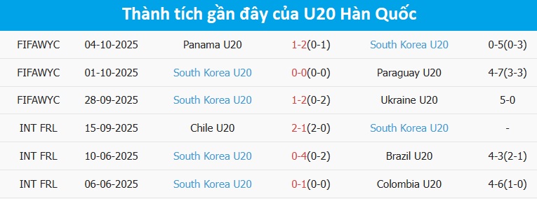 Phong độ U20 Hàn Quốc 6 trận gần nhất