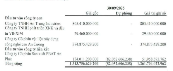 Theo BCTC quý 3/2025, NHH đang góp vốn vào 3 công ty con gồm: Công ty TNHH Phát triển Xuất nhập khẩu và Đầu tư - VIEXIM, An Trung Industries và CTCP Vật liệu Xây dựng Công nghệ cao An Cường. Ngoài ra, Công ty còn góp vốn vào công ty liên kết là CTCP Sản xuất PABT An Phát. Tổng giá trị đầu tư vào công ty con và công ty liên kết ở mức 1.3 ngàn tỷ đồng.