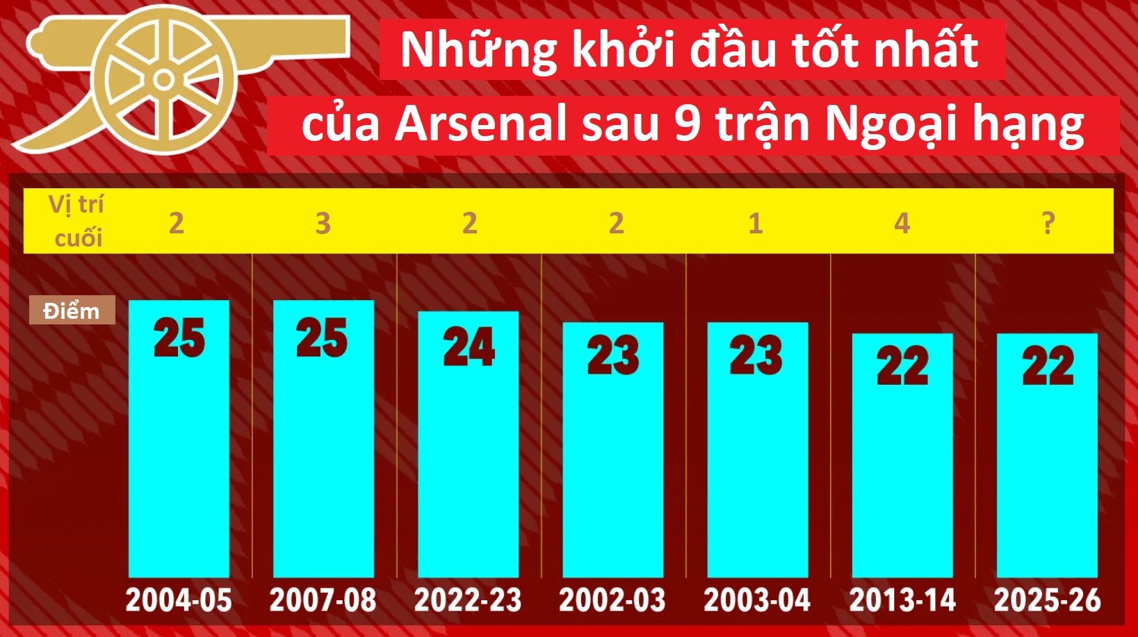 Arsenal đang thể hiện phong độ ấn tượng khi dẫn đầu Ngoại hạng Anh với 22 điểm, cách biệt 4 điểm so với đội xếp thứ hai Bournemouth và 6 điểm so với cả hai đội bóng thành Manchester. Tuy nhiên, lịch sử cho thấy khởi đầu tương tự không đảm bảo cho thành công cuối cùng.