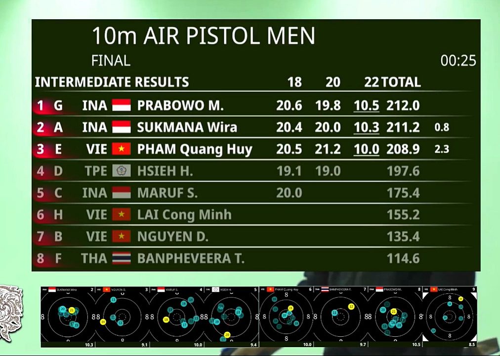 Đáng tiếc, cách biệt quá xa trước đó với 2 xạ thủ Indonesia khiến Quang Huy phải dừng bước ở vị trí thứ 3 chung cuộc, đồng nghĩa với tấm HCĐ.