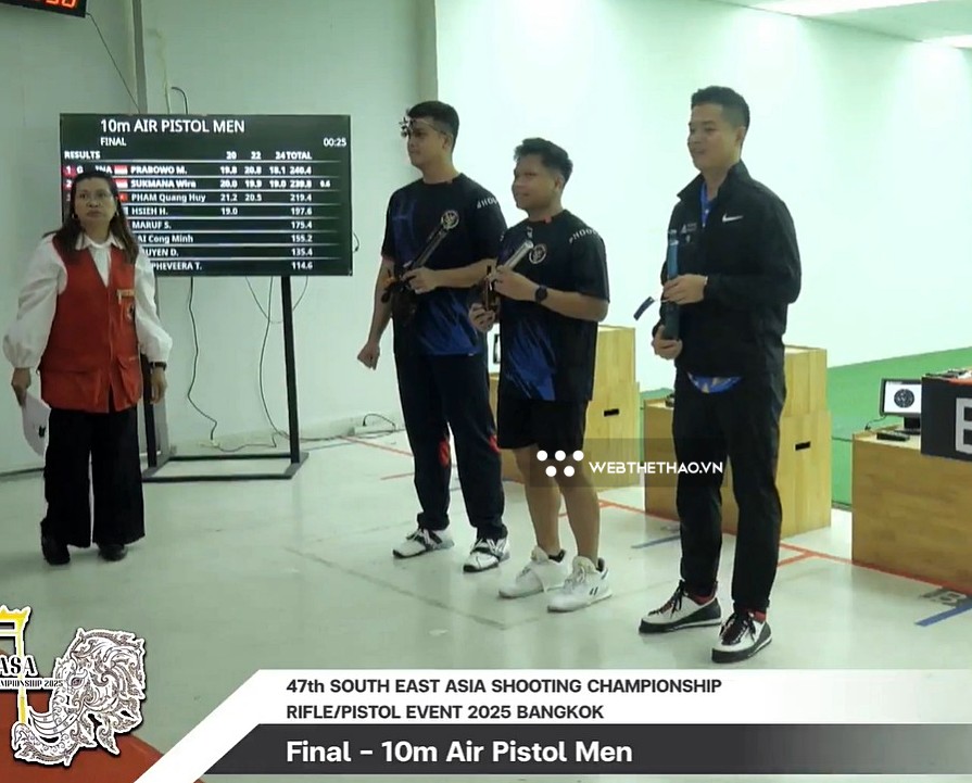 Ở nội dung sở trường 10m súng hơi ngắn vừa kết thúc, Phạm Quang Huy xếp thứ 3 chung cuộc, qua đó có tấm HCĐ thứ hai ở giải Vô địch Bắn súng Đông Nam Á 2025.