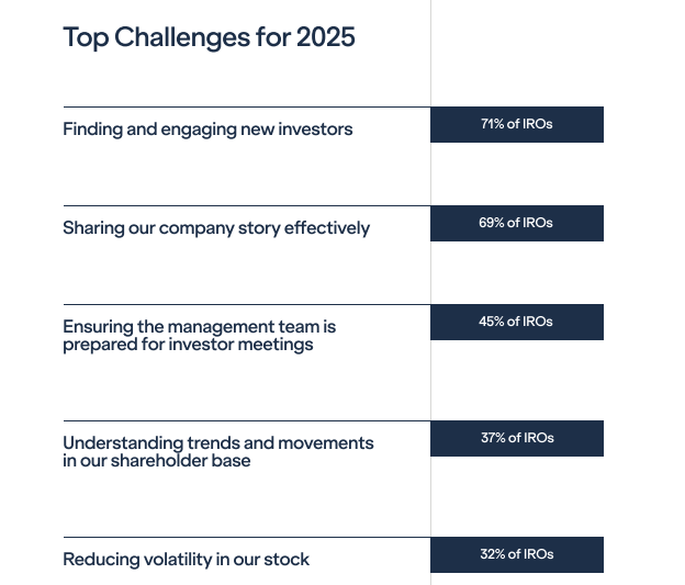 Hơn 1/3 chuyên gia IR cho biết họ gặp khó khăn trong việc theo dõi và hiểu rõ các xu hướng trong cơ cấu cổ đông của công ty. Đây là một thách thức quan trọng nhưng thường bị bỏ qua.