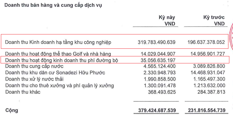 Động lực chính vẫn đến từ mảng kinh doanh cốt lõi hạ tầng khu công nghiệp mang về gần 320 tỷ đồng, tăng 63%; bên cạnh khoản doanh thu phát sinh từ thu phí đường bộ hơn 35 tỷ đồng.