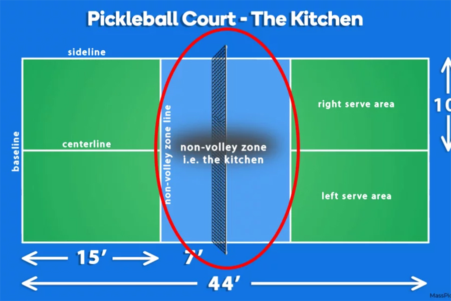 Tên gọi chính thức của khu vực này là “Non-Volley Zone” (NVZ) – vùng cấm volley. Người chơi không được phép đánh volley (tức là đánh bóng khi bóng chưa chạm đất) nếu bất kỳ phần nào của cơ thể họ chạm vào khu vực kitchen hoặc đường ranh giới của nó.