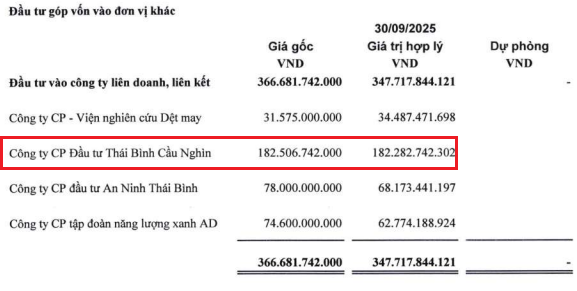 Tại thời điểm ngày 30/09/2025, giá trị đầu tư gốc của Damsan vào Thái Bình - Cầu Nghìn đạt 182.5 tỷ đồng. Giá trị hợp lý của khoản đầu tư này chỉ giảm nhẹ xuống còn 182.3 tỷ đồng, cho thấy mức biến động không đáng kể trước khi doanh nghiệp lên kế hoạch thoái vốn.