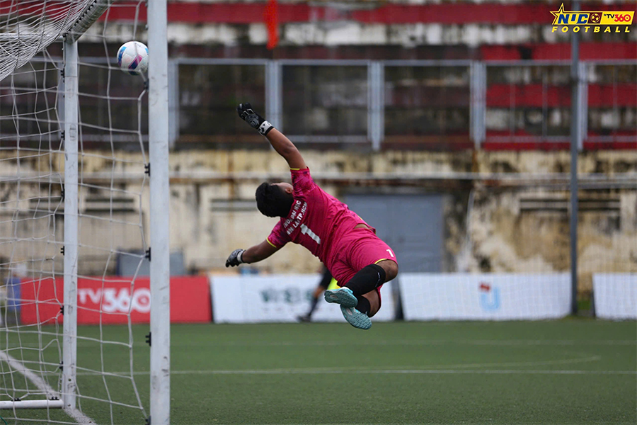Thủ môn Mạnh Tùng bay người hết cỡ, nhưng không thể cứu thua cho trường ĐH Nông Lâm TPHCM (Ảnh: Xuân Hoàng)