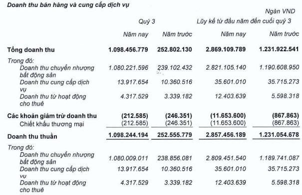 Doanh thu thuần hợp nhất của KDH trong quý 3 đạt gần 1.1 ngàn tỷ đồng, gấp 4.4 lần cùng kỳ, chủ yếu đến từ hoạt động chuyển nhượng bất động sản khi đóng góp đến 1.08 ngàn tỷ đồng.