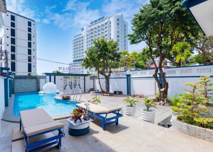 Bạn sẽ bắt gặp những chi tiết trang trí rất "biển" như lưới đánh cá, vỏ ốc, sao biển, tông màu xanh pastel nhẹ nhàng, kết hợp với nội thất gỗ mộc. Điểm đặc biệt nhất của homestay Vũng Tàu gần biển La Mer là những khoảng sân vườn rợp bóng cây, giàn hoa giấy và hồ bơi xanh mát. Nó tạo cảm giác như một ốc đảo tách biệt hẳn với khói bụi ồn ào bên ngoài.