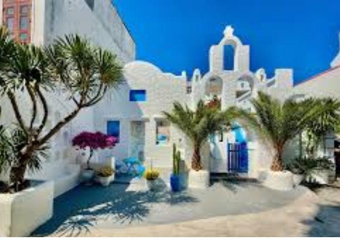 Điểm "ăn tiền" nhất của Santoni chính là phong cách kiến trúc mô phỏng hòn đảo thiên đường Santorini (Hy Lạp). Màu trắng tinh khôi của tường kết hợp với màu xanh coban của cửa vòm và mái che, tạo cảm giác cực kỳ mát mẻ, xua tan cái nóng miền biển.