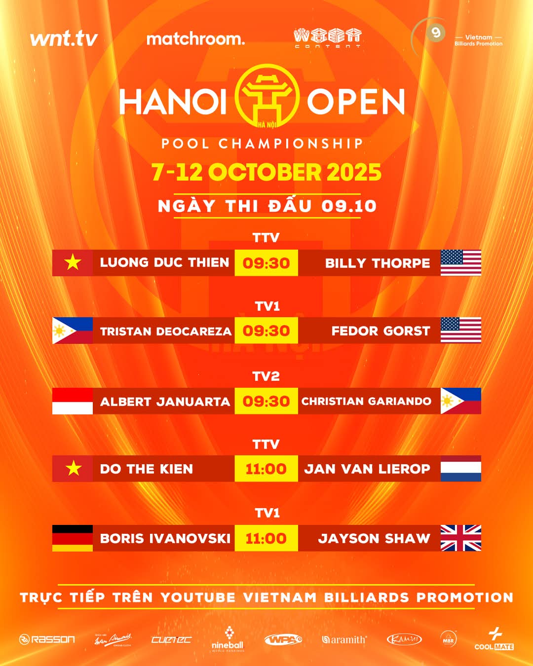 Cập nhật link trực tiếp ngày thi đấu 9/10 của Hanoi Open Pool 2025. Trận đấu giữa Dương Quốc Hoàng và Nguyễn Anh Tuấn dự kiến diễn ra lúc 14h00.