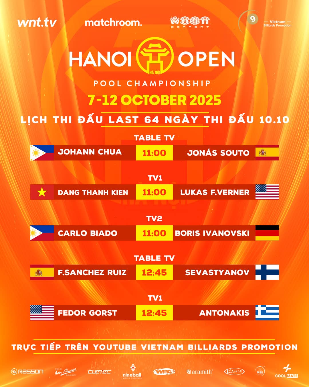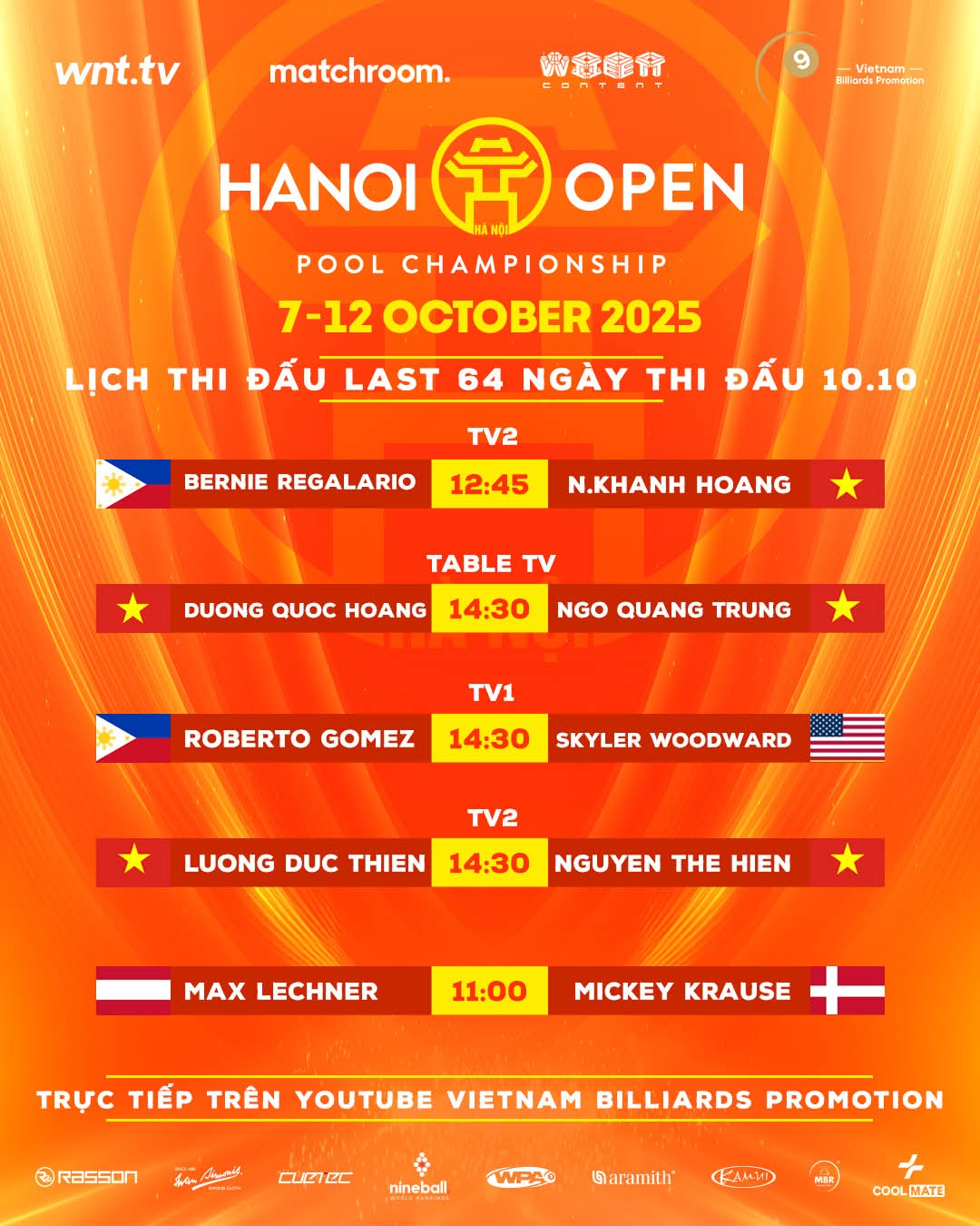 Cập nhật link trực tiếp các trận đấu vòng Last 64 và Last 32 Hanoi Open Pool 2025 ngày 10/10.