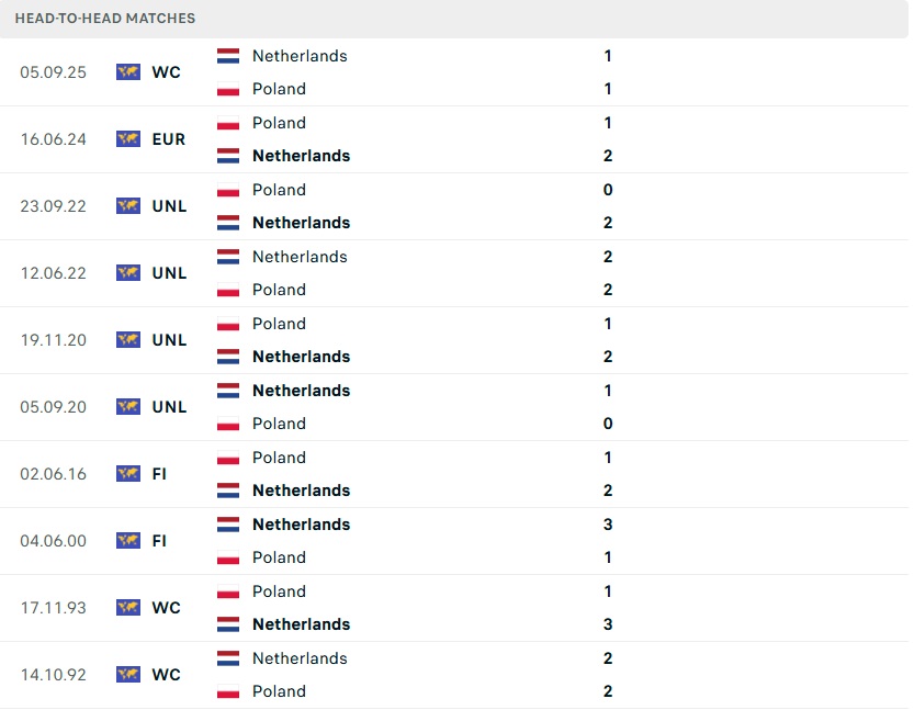 Lịch sử đối đầu đang nghiêng về Hà Lan với 10 chiến thắng trong 21 lần chạm trán. Dù vậy, hai trong bốn cuộc gặp gần nhất giữa hai đội đã kết thúc bất phân thắng bại, cho thấy Ba Lan đang tiến bộ và hoàn toàn có thể tạo ra thách thức thực sự tại Warsaw. Trận đấu vì thế hứa hẹn sẽ rất căng thẳng và mang tính quyết định cho cục diện bảng G.