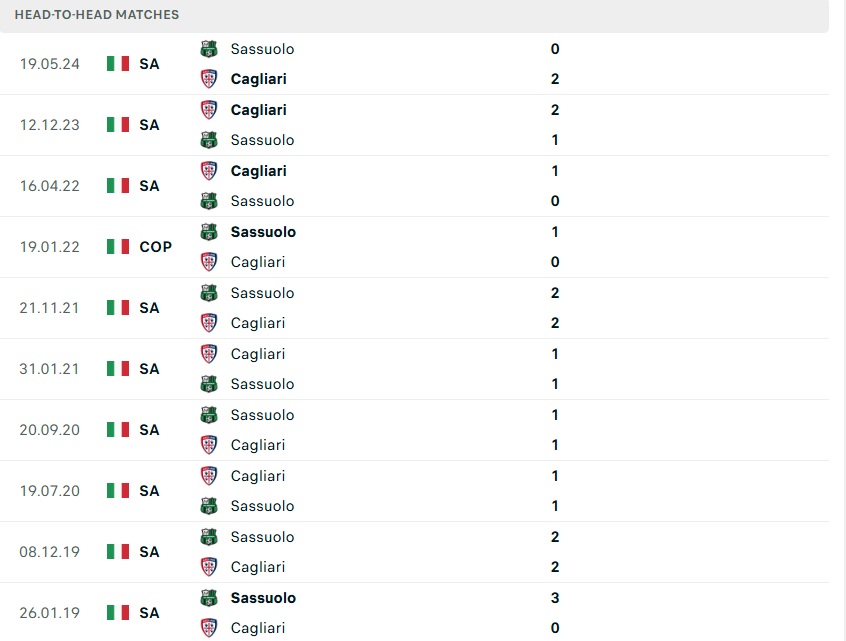 Dẫu vậy, Cagliari vẫn có lợi thế tinh thần khi toàn thắng cả 3 lần đối đầu gần nhất với Sassuolo, ghi 5 bàn và chỉ thủng lưới 1 lần. Với tình hình hiện tại, hai đội có thể sẽ phải hài lòng với một kết quả hòa.