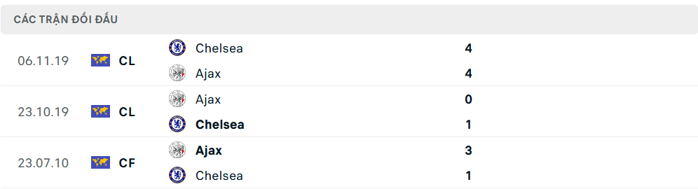 Lịch sử đối đầu Chelsea vs Ajax