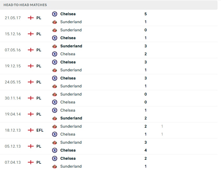Lịch sử đối đầu cũng đứng về phía Chelsea khi họ thắng 13/16 lần tiếp đón Sunderland tại Premier League. Với đà thăng hoa hiện tại, một chiến thắng sít sao cho The Blues là kịch bản được dự đoán nhiều nhất.