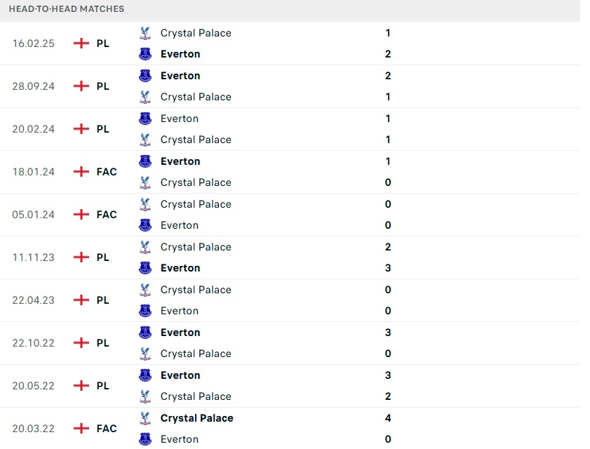 Tuy vậy, Everton vẫn có niềm tin nhờ điểm tựa sân nhà và thành tích đối đầu ấn tượng trước Crystal Palace. Họ đã bất bại 20/21 lần gặp đối thủ này tại Premier League và chưa từng thua trên sân nhà kể từ năm 2014.