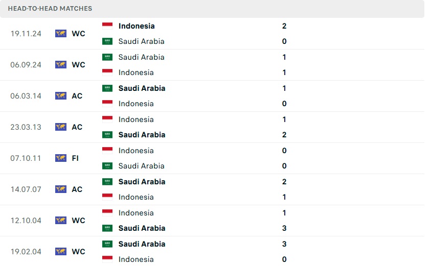Lịch sử đối đầu đang nghiêng hẳn về Saudi Arabia với 11 chiến thắng sau 14 lần gặp nhau. Phong độ thiếu ổn định của Saudi Arabia cùng sự tiến bộ mạnh mẽ của Indonesia khiến cục diện trận đấu sắp tới trở nên khó lường. Dù vậy, với kinh nghiệm và chất lượng nhân sự vượt trội, Saudi Arabia vẫn được đánh giá nhỉnh hơn đôi chút.