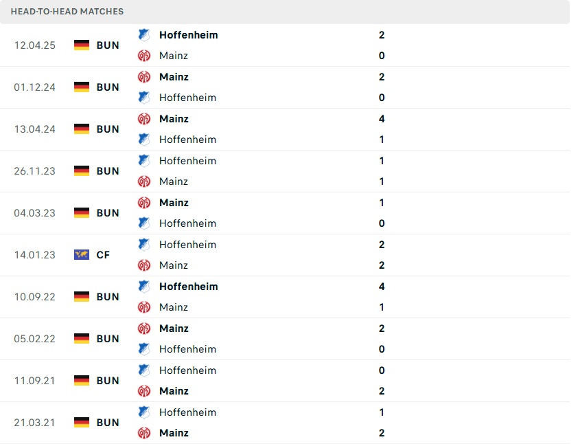 Lịch sử đối đầu Mainz vs Hoffenheim