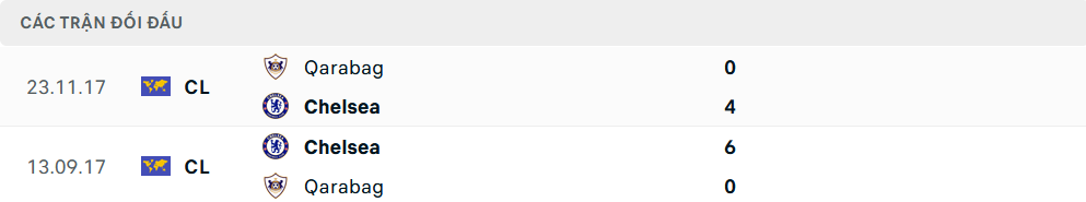 Lịch sử đối đầu Qarabag vs Chelsea