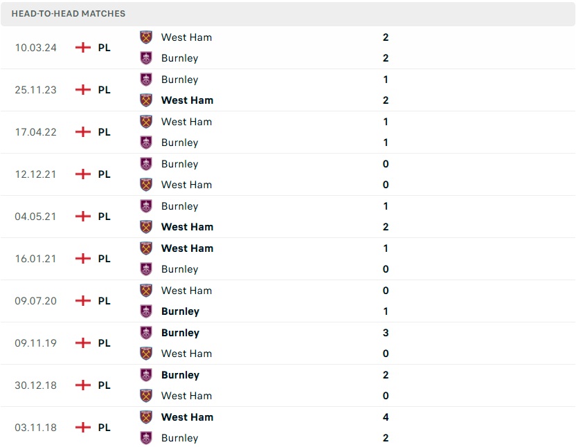 Tuy nhiên, thách thức dành cho Burnley là rất lớn, bởi họ chỉ thắng 2 trong 11 lần gần nhất làm khách trước West Ham, để thủng lưới tới 20 bàn trong chuỗi trận đó.