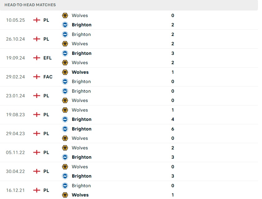 Tuy nhiên, lịch sử đối đầu không ủng hộ “Bầy sói”. Wolves chưa thắng Brighton tại Premier League kể từ tháng 12/2021 và từng thua 0-2 ở lượt về mùa trước. Với phong độ hiện tại và lực lượng sứt mẻ hai bên, nhiều khả năng đây sẽ là một trận đấu giằng co, nơi kết quả hòa là kịch bản dễ xảy ra.