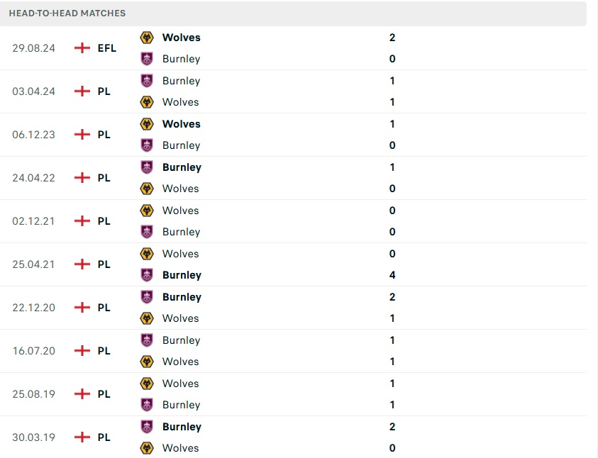 Lịch sử đối đầu Wolves vs Burnley